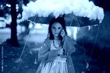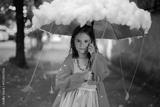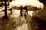 Little Girl Wearing a Handmade Rain Costume For Halloween. Happy child showing off her arts and craft project for costume party