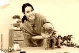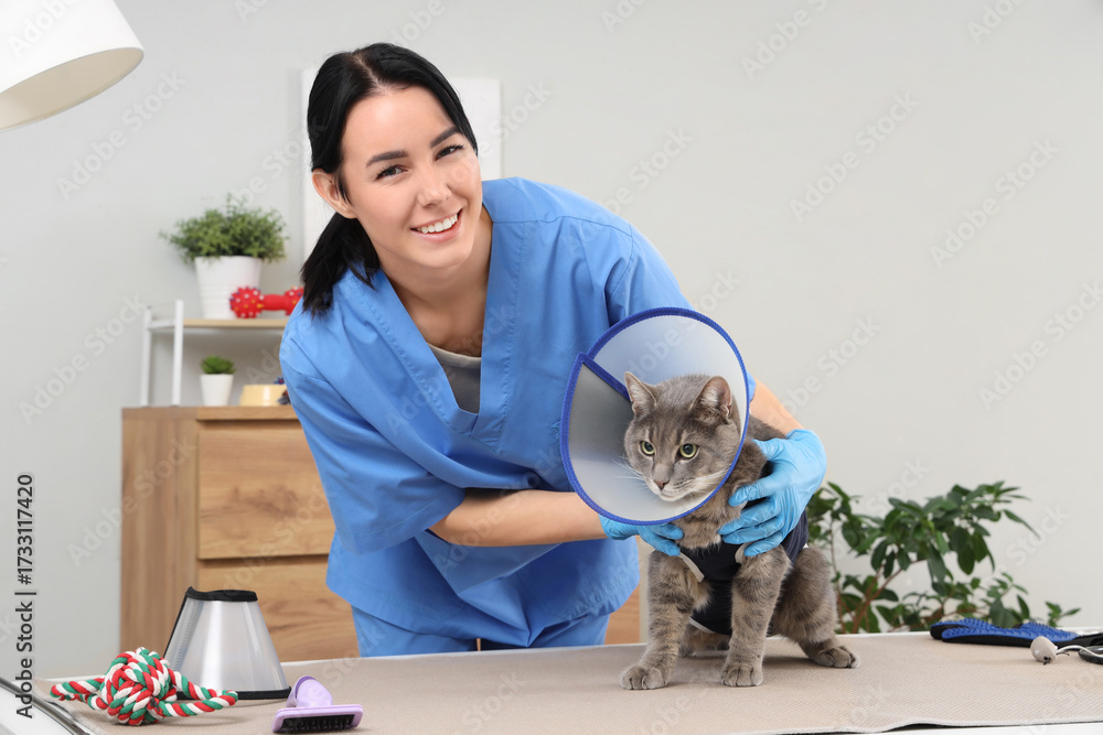 Female veterinarian and cat with Elizabethan collar after sterilization in vet clinic