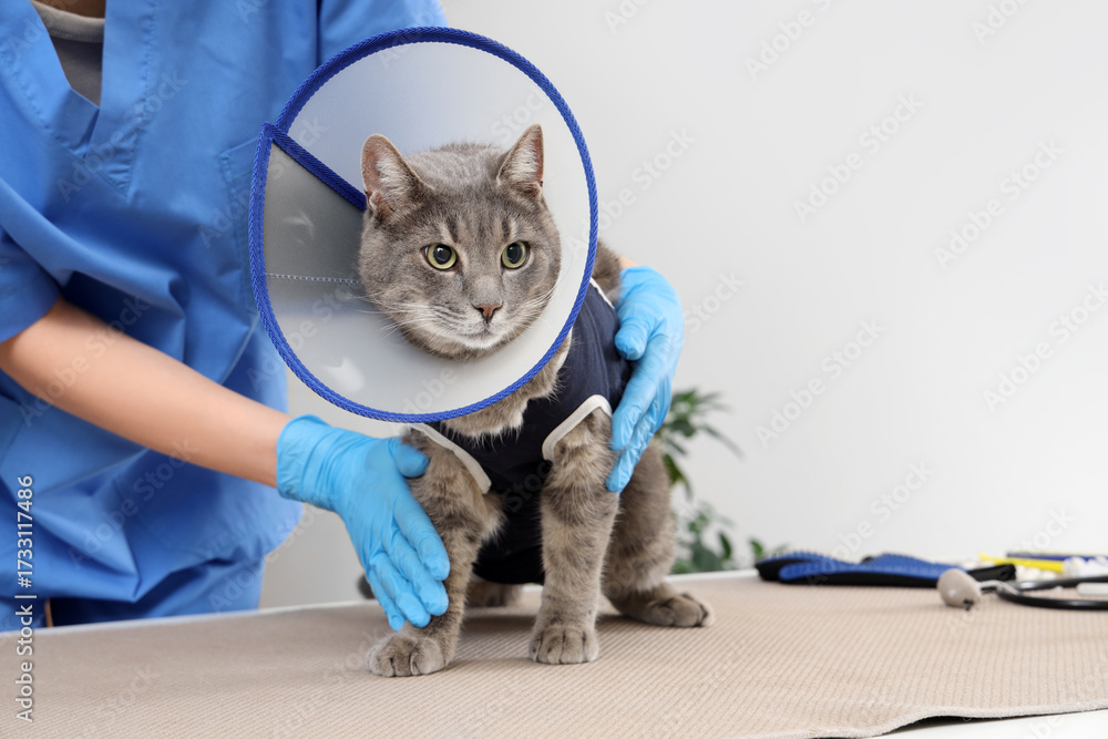 Female veterinarian and cat with Elizabethan collar after sterilization in vet clinic