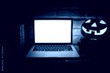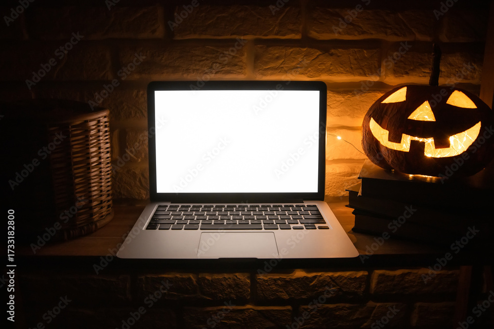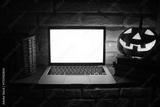 Laptop with a blank white screen mockup with space for text on a wooden shelving in evening dark room next to scary Halloween jack o lantern. Online holiday shopping and sale.