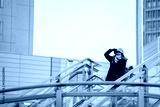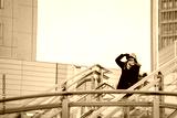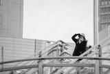 Asian woman photographer using camera taking picture of urban cityscape architecture building in winter season. Young woman traveler enjoy outdoor active lifestyle travel and walking city street.
