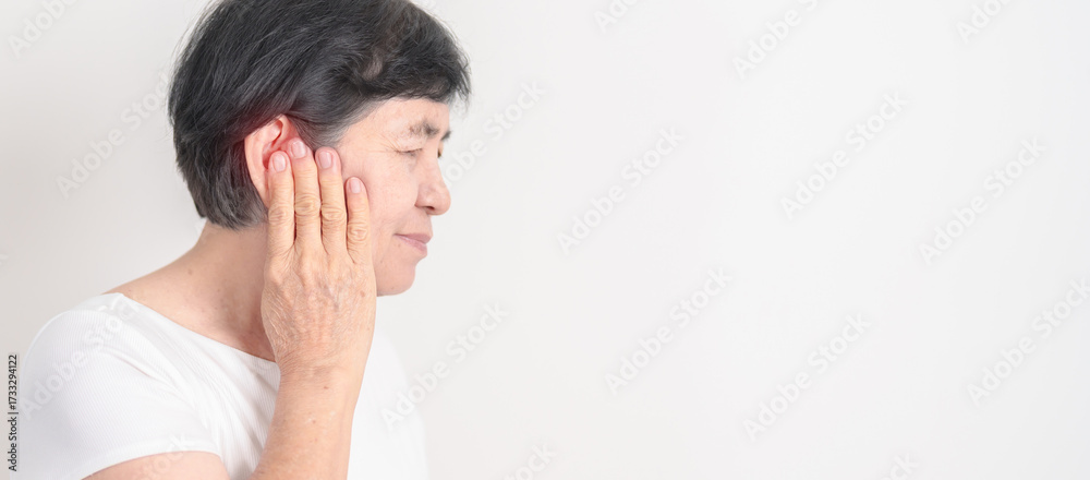 Elderly Woman having Ear pain for concept of Ear disease, Atresia, Otitis Media, Infection, Pertorated Eardrum, Meniere syndrome, Otolaryngologist, Hearing Loss, Hyperacusis, Tinnitus and Earwax