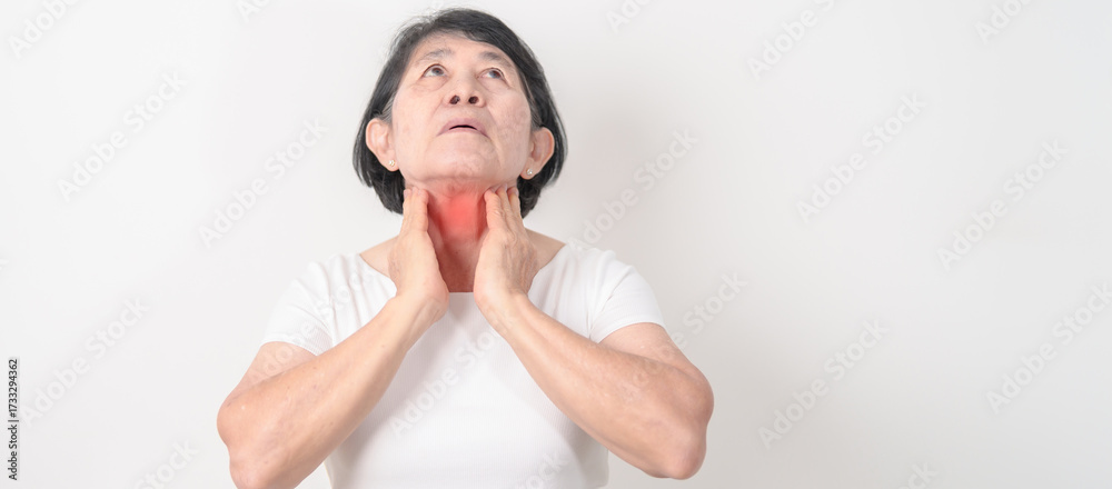 elderly Woman checking Thyroid gland disease. Hand holding Neck pain and Sore Throat. Hyperthyroidism, Hypothyroidism, Hashimoto Thyroiditis, Thyroid Tumor and Cancer, Postpartum, Papillary Carcinoma