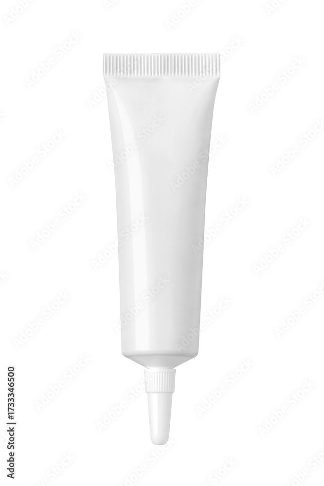 Blank white plastic squeeze tube with pointed nozzle cap for cosmetic product mockup isolated on white background