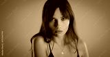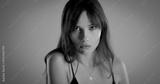 Black and white portrait of beautiful model posing in studio during fashion photoshooting