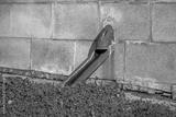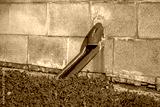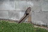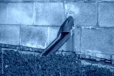 A fragment of a rusty downpipe on the wall of a house on an autumn day