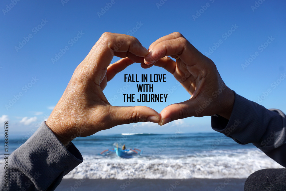 Inspirational motivational quote - Fall in love with the journey. With person showing love hands gesture against the blue sky over the sea background. Enjoy the process concept.