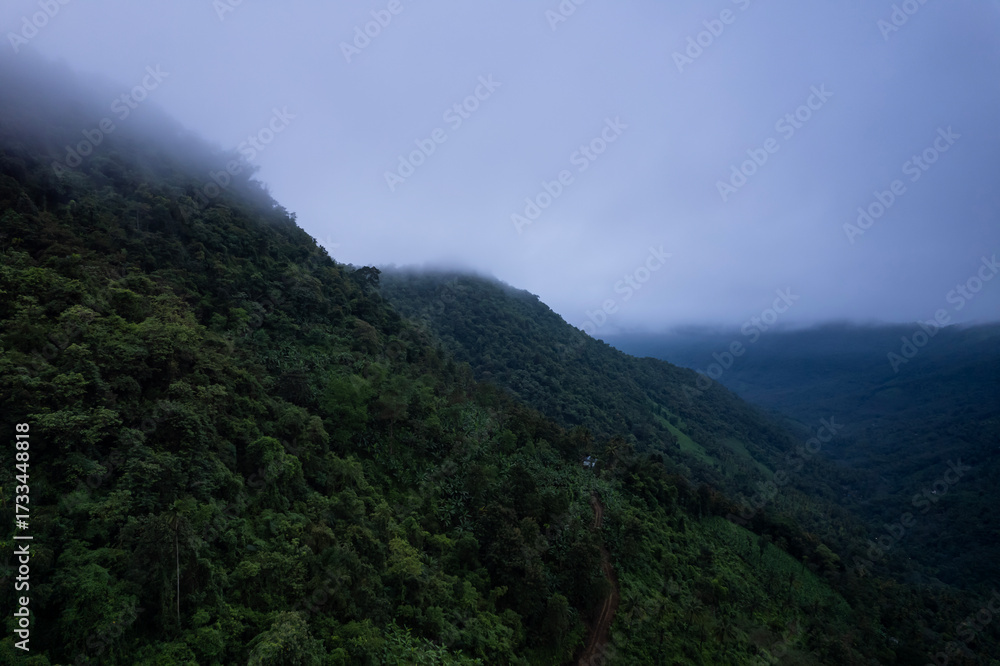 Aerial view of mist covered mountains and lush Kerala landscape on a foggy morning, Shot from Kerala