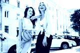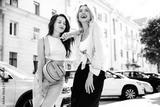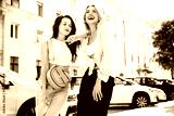 Two young beautiful smiling female in trendy summer clothes. Sexy carefree women posing in the street. Positive models having fun, hugging in sunny day. With bright makeup and red lips