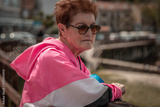 Side view portrait of senior woman on summer vacation looking at landscape and enjoying sunny day, active female traveler