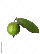 Isolated Guava Fruit One Whole Green And A Sliced Half With Pink Interior Surrounded By Leaves