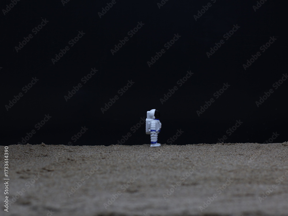 The image shows a miniature astronaut standing on a sandy or dusty surface resembling the landscape of the moon or planet.