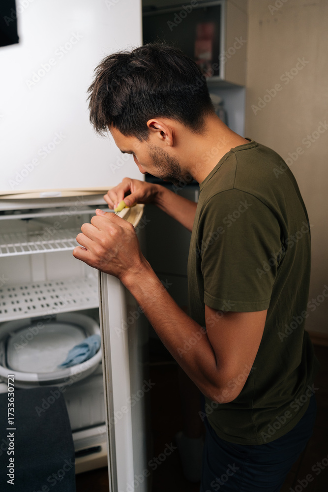 Vertical shot of focused young man cleaning refrigerator door seal with yellow sponge, focusing on detailed sanitation and preserving appliance functionality during routine kitchen maintenance.