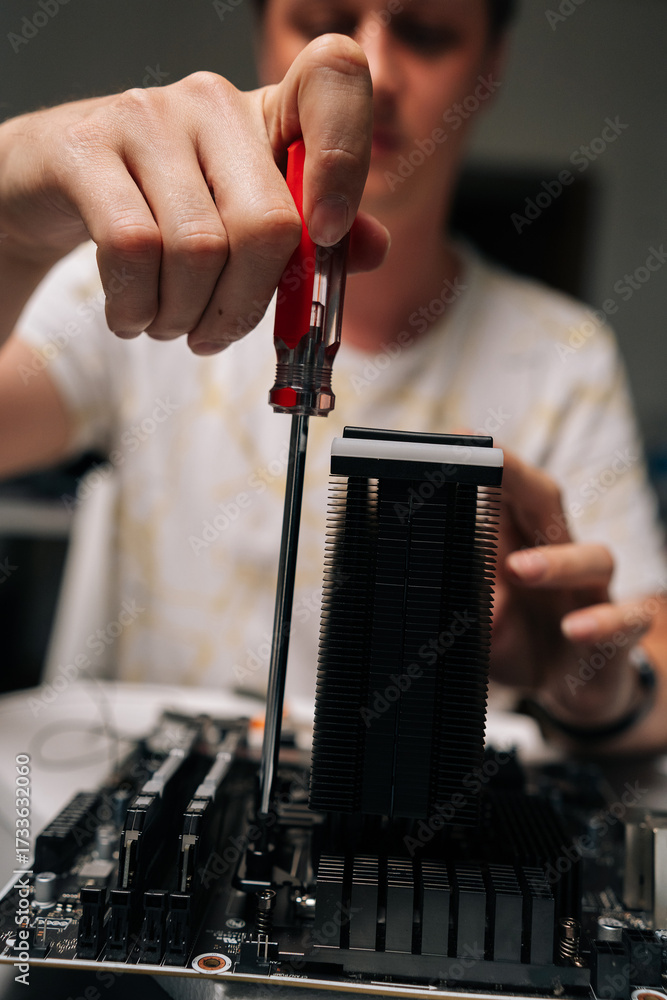 Close-up of technician installing CPU cooler onto motherboard with screwdriver, conducting maintenance and upgrades on desktop computer for improved performance and efficiency.