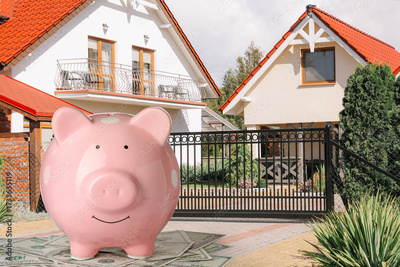 Save money to buy home. Pink piggy bank with dollars and house outdoors