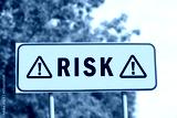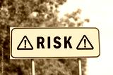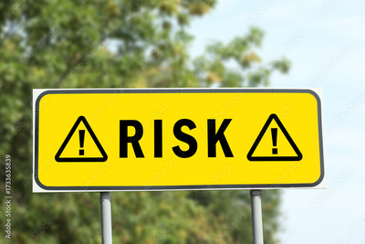 Yellow road sign with word Risk and warning signs outdoors