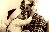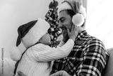 Little girl in Santa hat holding her father’s face with love, both smiling warmly in front of a glowing Christmas tree, sharing a tender holiday moment.
