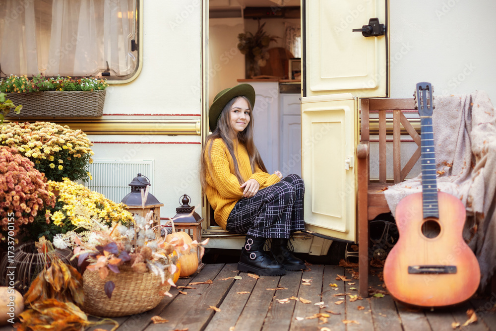 Cute young girl in hat and yellow sweater sit at caravan trailer door. Child in campsite autumn. Concept adventure. Smiling teen girl on porch RV house with pumpkins, flowers, decor fall for Halloween