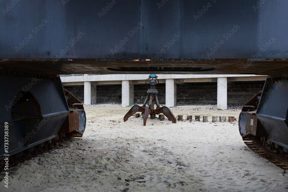 Industrial construction equipment on sandy ground with a rusty mechanical grabber placed between heavy tracked machinery under a large metal structure.