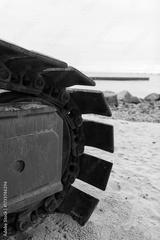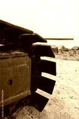 Close-up view of a heavy-duty industrial track wheel with visible metal details, bolts, and rust textures, resting on sand near the sea.