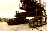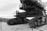 A large industrial tracked vehicle on sandy ground, with visible hydraulic systems, a metal structure, and robust tracks. The technical details, scale, and power of this industrial equipment are demon