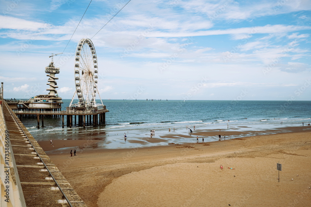 The Hague, Netherlands, August 27, 2025. People relaxing on the beach near the famous Sky View pier. Wide angle view, blue summer sky with clouds