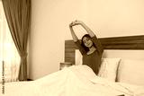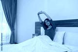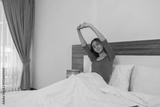 Asian woman waking up from good sleep on bed in weekend morning resting in comfort bedroom relaxation on lazy day