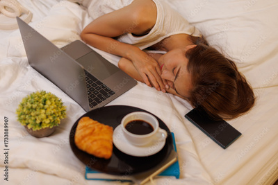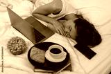 A cup of coffee, asian woaman, diary and address book with the laptop on the bed with a beige plaid