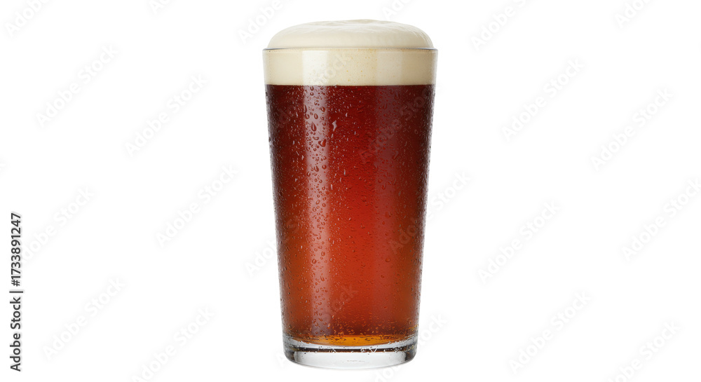 Refreshing amber ale in a tall glass isolated, cold beer with foam head and condensation for summer refreshment