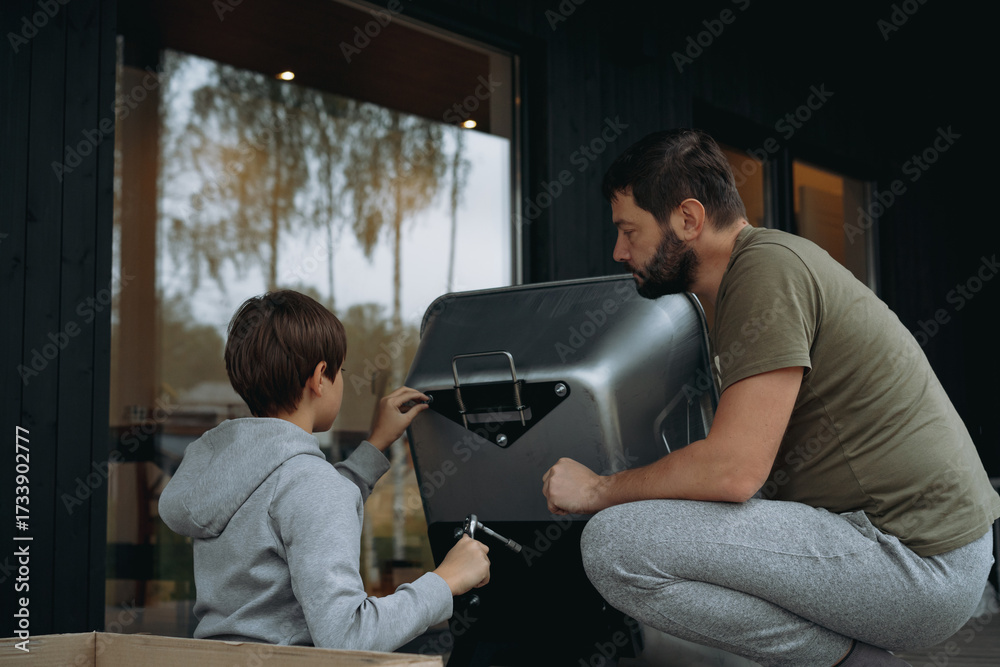 teenage boy helping his father assemble a wheelbarrow with a screwdriver
