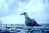 Young, gray and brown feathered seagull standing , close up shot, no people