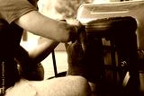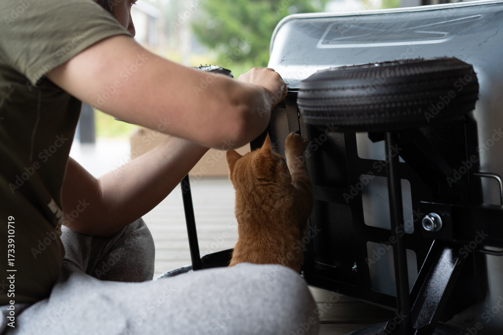 man repairing or assembling a wheelbarrow. ginger cat new ahim
