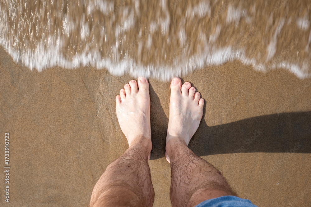 Caucasian male bare feet and pulled up jeans, standing on a sandy beach with shallow tidal waves sea water reaching the shore. Top down, close up view