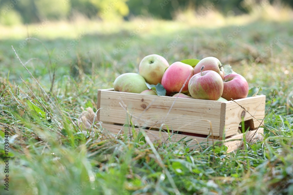 Ripe apples in wooden crate on green grass outdoors