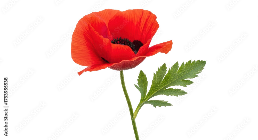 Isolated Red Poppy Flower, Single Bloom with Green Leaves on Stem, Floral Still Life