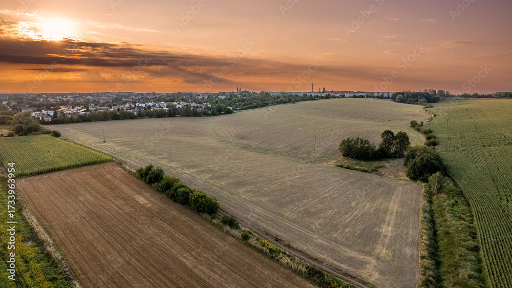 Aerial Sunset View of Rural Fields and Meadows, Poland – Countryside Landscape