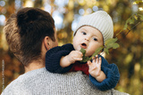 Cute baby son with funny emotions holding leaves close up in father hands in autumn woods. Fatherhood. Stylish man with adorable child in cozy warm sweaters relaxing in fall park