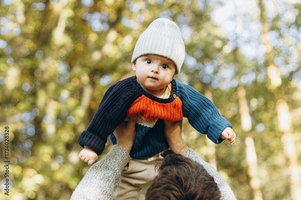 Cute baby son with funny emotions in father hands close up in autumn woods. Fatherhood. Stylish man with adorable child in cozy warm sweaters having fun and relaxing in fall park