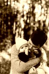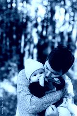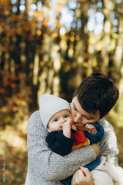 Happy father hugging and kissing cute baby son in autumn woods. Fatherhood. Stylish man with adorable child in cozy warm sweaters embracing and relaxing in fall park