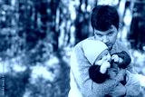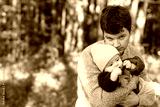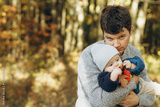 Happy father hugging cute baby son in autumn woods. Fatherhood. Stylish man with adorable child in cozy warm sweaters embracing and relaxing in fall park