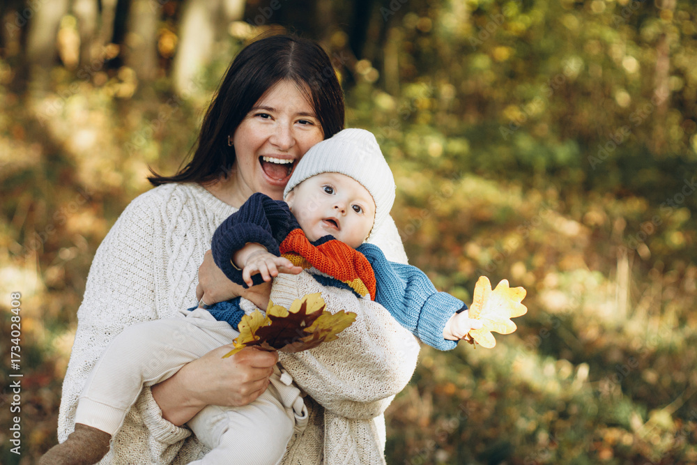 Happy mother hugging cute baby son in autumn woods. Motherhood. Stylish woman with adorable child in cozy warm sweaters embracing and relaxing in fall park