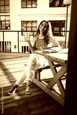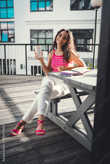Smiling young woman raising coffee cup with notebook on table, enjoying fresh air and sunshine. Celebrates joyful solitude, relaxation, and peaceful creativity in city setting.