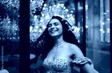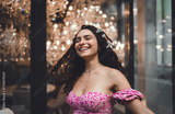 Happy Hispanic woman with curly hair and flowers dancing freely in pink floral dress, eyes closed in joy, symbolizing freedom, femininity, and empowerment in modern lifestyle imagery.