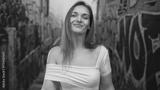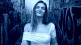 Woman in white top smiles and points finger towards camera on an urban graffiti street; confidence playfulness curiosity boldness.