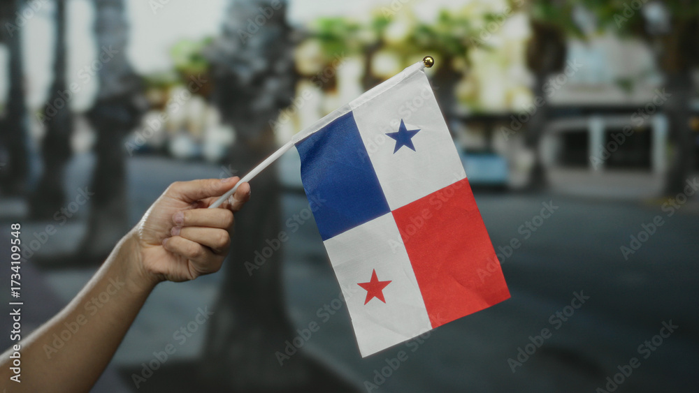Caucasian man holding panamanian flag on a city street, symbolizing national pride and celebration outdoors on a sunny day.