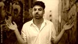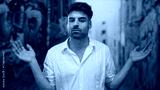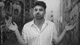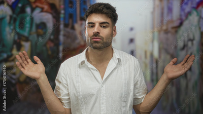 Young man in white shirt holds bare hands up before graffiti wall on urban street; uncertainty doubt.