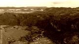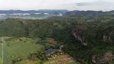 Aerial view of Phu Pha Man mountain in Khon Kaen, Thailand, displaying the local village, limestone cliffs, verdant forest, and picturesque valley. A natural environment that represents Thai tourism