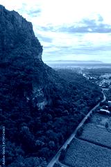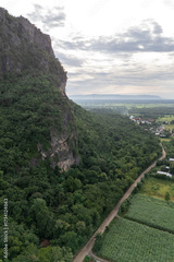 Aerial view of Phu Pha Man mountain in Khon Kaen, Thailand, displaying the local village, limestone cliffs, verdant forest, and picturesque valley. A natural environment that represents Thai tourism