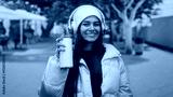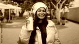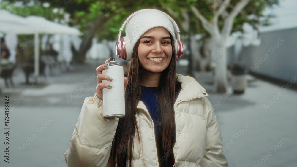 Woman in a park holds spray can, wearing headphones and a coat, with trees and cafes in the background, conveying creative outdoor graffiti activity.