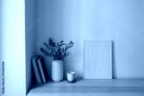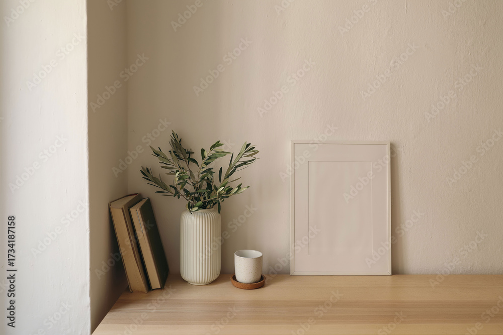 Vase with olive branches, old books. Cup of tea, coffee cork tray. Home office table. Blank white vertical picture frame mockup. Minimal Scandi Mediterranean interior. Beige wall background.